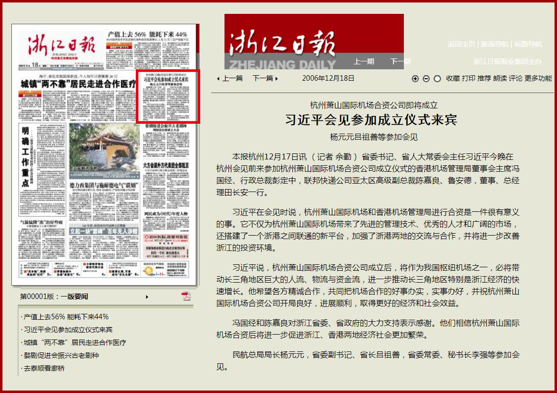 2006年12月17日,浙江省委書記、省人大常委會主任習近平今晚在杭州會見前來參加杭州蕭山國際機場合資公司成立儀式的香港機場管理局董事會主席馮國經、行政總裁彭定中