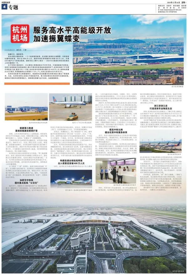 今天(12月16日),中國民航報整版刊登專題報道《杭州機場:服務高水平高能級開放 加速振翼蝶變》,聚焦杭州機場在助力浙江推進高水平對外開放、建設高能級開放強省中的“蓄勢”與“動能”,