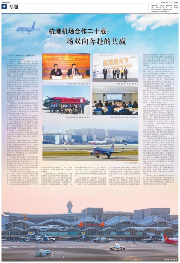 今天(1月17日),中國民航報整版刊登專題報道《杭港機場合作二十載:一場雙向奔赴的共赢》,回顧過去二十年間,杭港兩地機場攜手共進、迎潮而上,在同一片長空之下共同繪就的美好篇章。