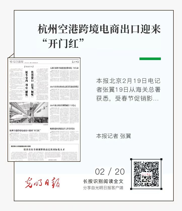 光明日報:杭州空港跨境電商出口迎來“開門紅” 今天(2月20日),光明日報刊登《杭州空港跨境電商出口迎來“開門紅”》。