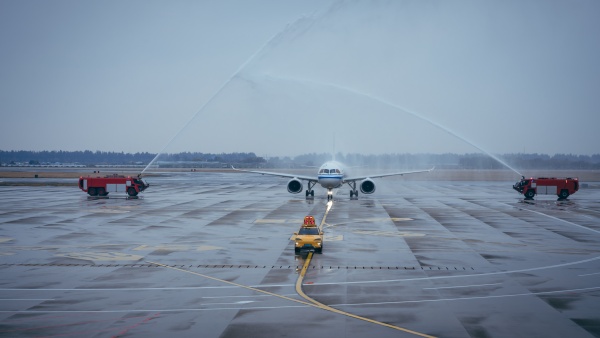 2月20日11時44分,搭載133名旅客的CA1567航班平穩降落溫州龍灣國際機場,這架注冊号爲B-919Y的C919國産大飛機身披國旗,緩緩滑行通過象征民航界最高禮遇的“水門”。