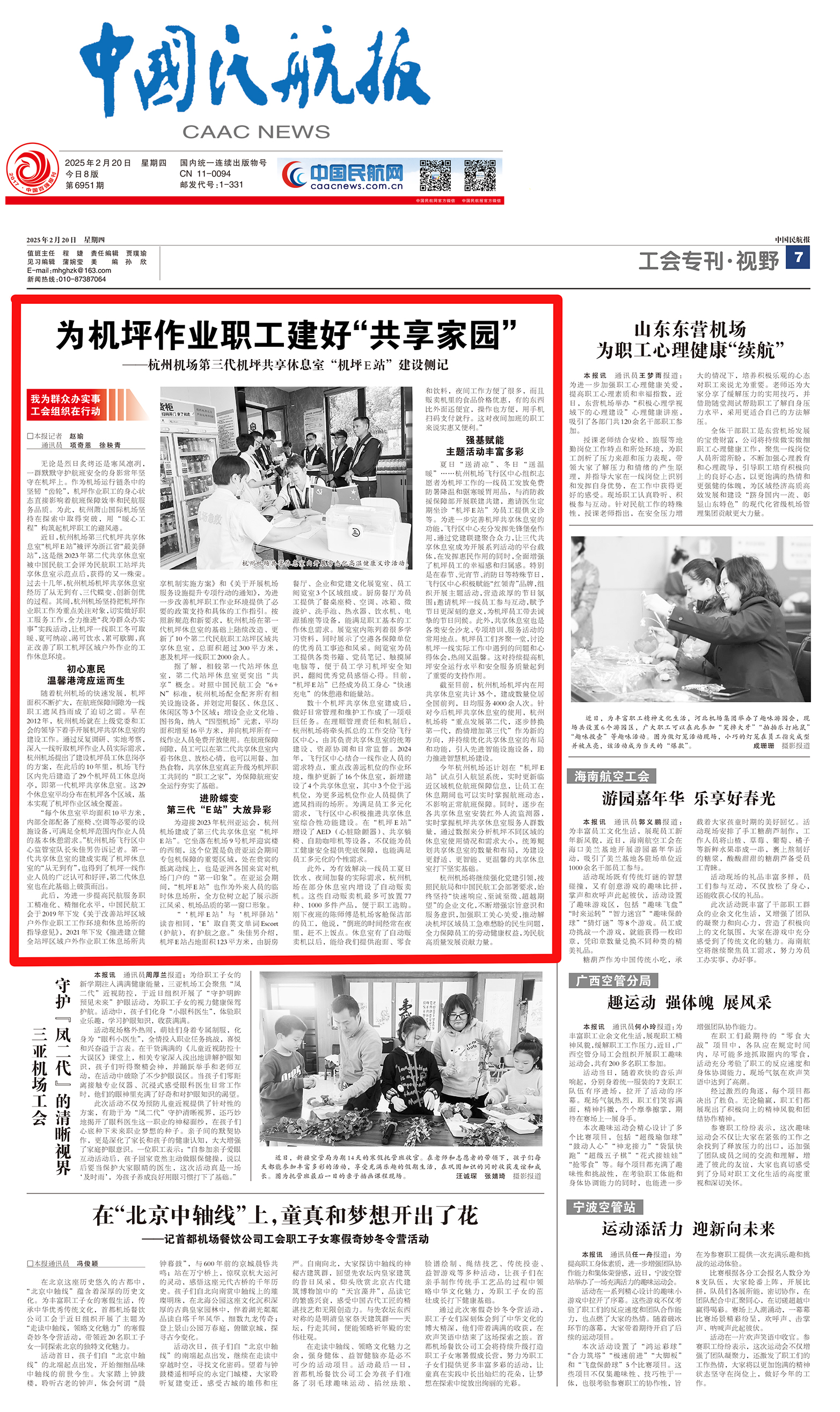 中國民航報刊登《爲機坪作業職工建好“共享家園”——杭州機場第三代機坪共享休息室“機坪E站”建設側記》。