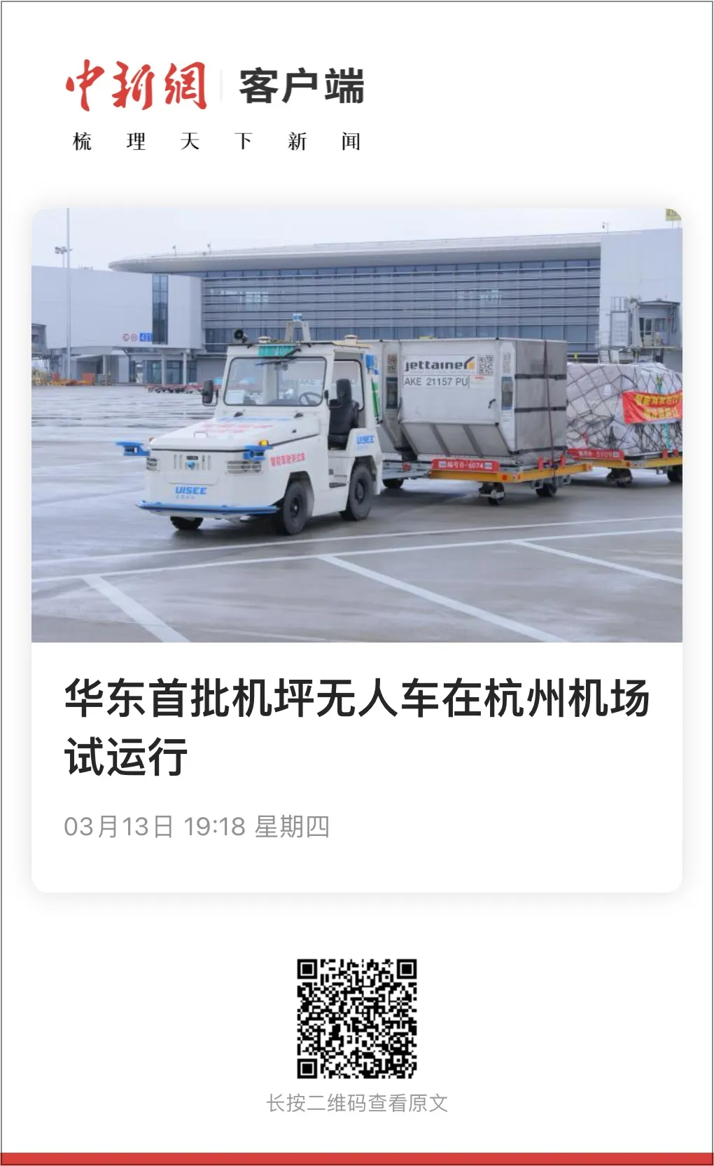 3月13日,中國新聞網發布《華東首批機坪無人車在杭州機場試運行》。